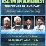 As Muslims living in America, we face many challenges to our faith. Join us for a much needed discussion on Saturday, August 24th at 1 pm that will analyze the future of Islam in America from four perspectives: family, community, Islamic centers, and clergy.