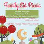 Join us for a Family Eid Picnic on Saturday, June 15th at 1 pm. The picnic will be held at Crystal Lake Park (2401 Axe Factory Rd, Bordentown, NJ 08505). The cost will be $10 per person, and children under 10 years of age will be admitted for free. Included is food, snacks, sports, games, activities, prizes, and much more. Please see the flyer below for more information.