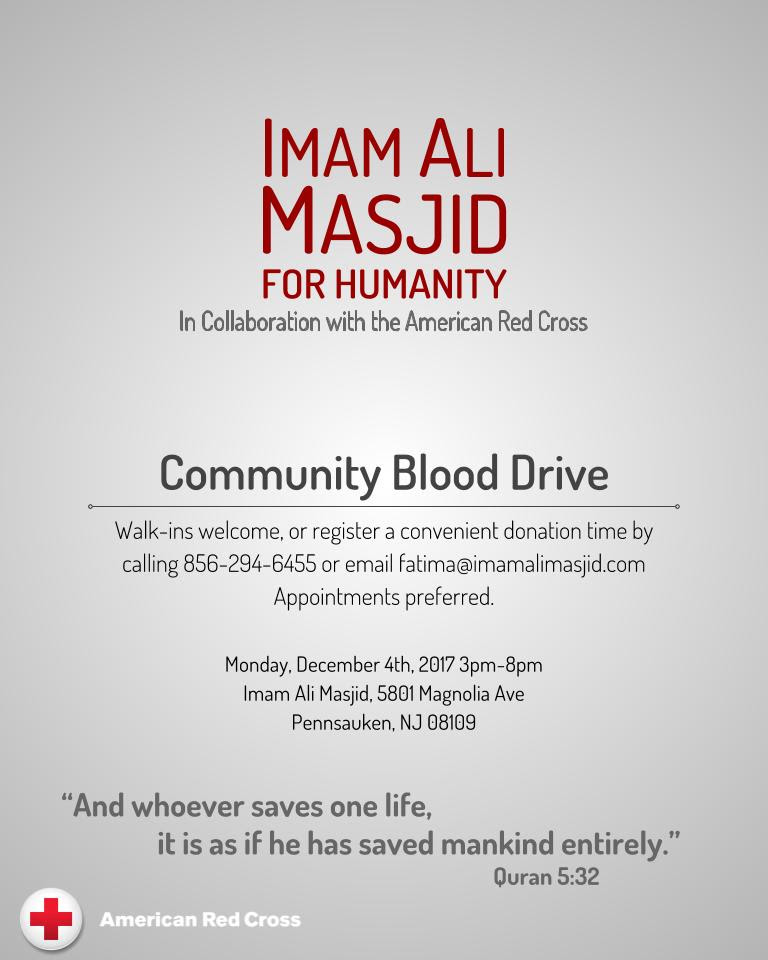 Please call 856-294-6544 or email fatima@imamalimasjid.com to register a convenient donation time or for any questions. Donors can also use this link to register a donation time: http://www.redcrossblood.org/give/drive/driveSearchList.jsp… (Sponsor Code: Imam Ali Masjid).