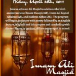 Please join us on Friday, April 28th as we commemorate the Birth of Imam Husayn (AS), Imam Ali Zaynol Abideen (AS), and Hadhrat Abbas (AS).  The program will begin at 630pm.  Additional detail can be found on the flyer below.