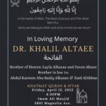 It is with sadness that we must announce the passing of Marhoom Dr. Khalil Altaee.  There will be a Khatme Quran in his honor on Friday, April 15th at 6:30 pm.
