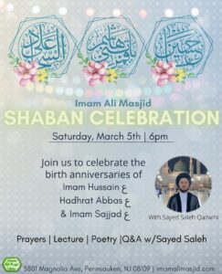 Join us for the nightly Ramadhan program at Imam Ali Masjid starting from April 20th until the end of Ramadhan at 7pm. The program will begin with a speech by Sheikh Ameeni, followed by Maghrib and Isha prayers, and will conclude with Iftar and Dua Iftitah. Additionally, on the nights of Laylatul Qadr, the a’maal will be performed directly after iftar, as well as the observances for the martyrdom of Imam Ali (AS).