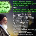 Join us on Sunday, October 27th at 4pm to commemorate the martyrdom of the Holy Prophet (SAW) and Imam Hasan (AS), and the 40th of Marhoom Ayatullah Sajidi. The program will include recitation of Quran by Sayyid Roohullah Wahidi, English lecture by Sayyid Atiq Ebady, and Farsi lecture by Ayatullah Sakhawat Hussain, and conclude with prayers and dinner. Please see the flyer for details.
