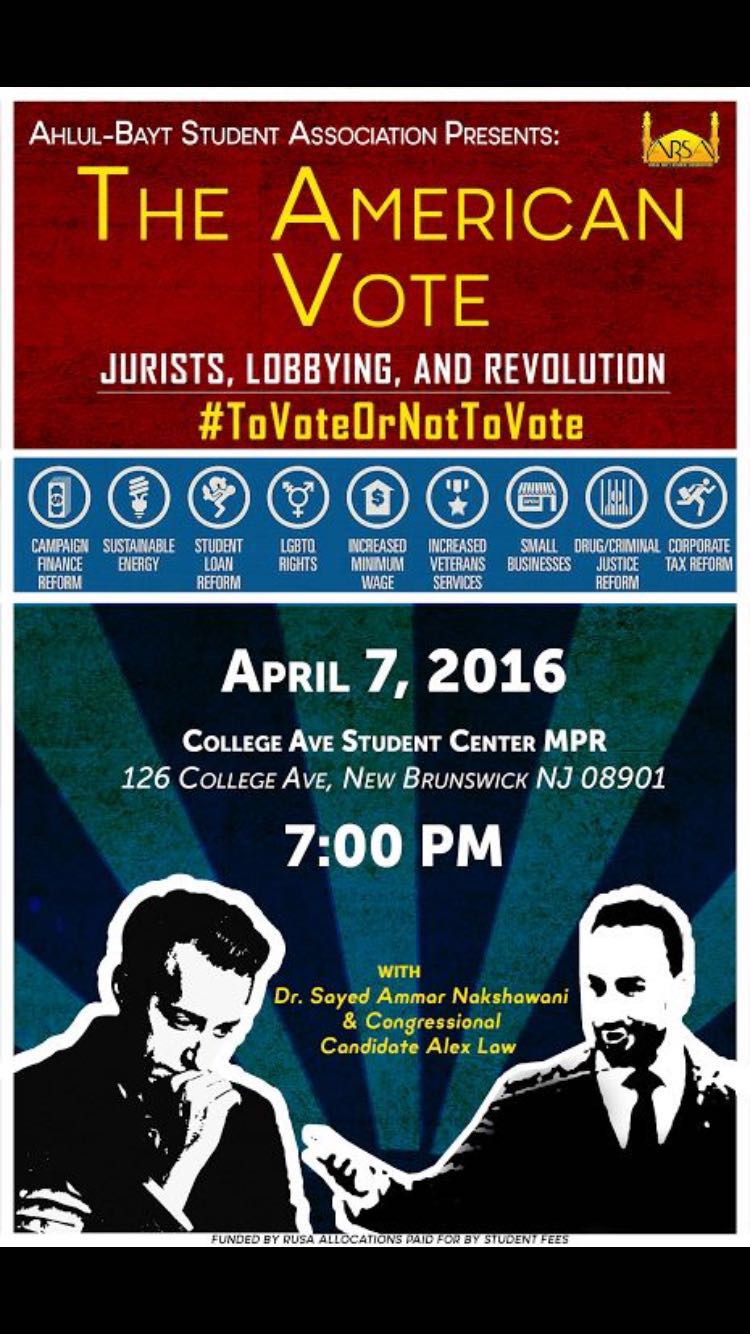 Please note that Shab-e-Jummah has been cancelled for April 7th. We encourage everyone to attend the Rutgers University Ahlul-Bayt Student Association’s event called “The American Vote: Jurists, Lobbying, and Revolution”. As the presidential election has showed us; our voices matter and we need to make sure it is heard. Voter registration forms will be available at the event. More details can be found in the attached flyer and on the event page at: https://www.facebook.com/events/489773967874097/