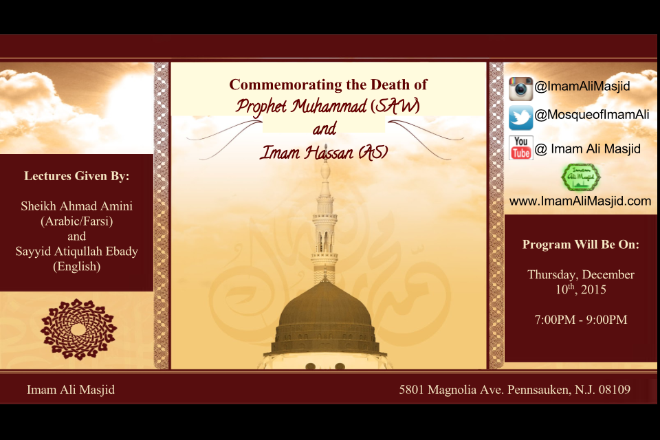 Please join us next Tuesday as we commemorate the birth of Prophet Muhammad (SAW) and Imam Jafar al-Sadiq (AS). The program will begin at 7PM.